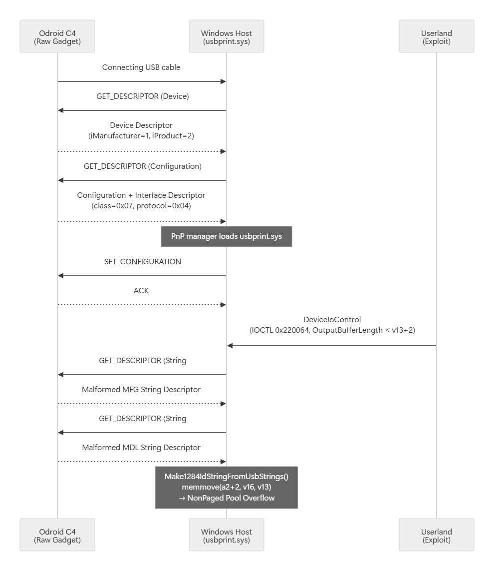 A specially crafted USB printer device is connected to the target system. The PnP manager loads usbprint.sys, and the configuration descriptor with InterfaceProtocol = 0x04 sets DeviceExtension[1065] = 1 and DeviceExtension[1064] = 0.