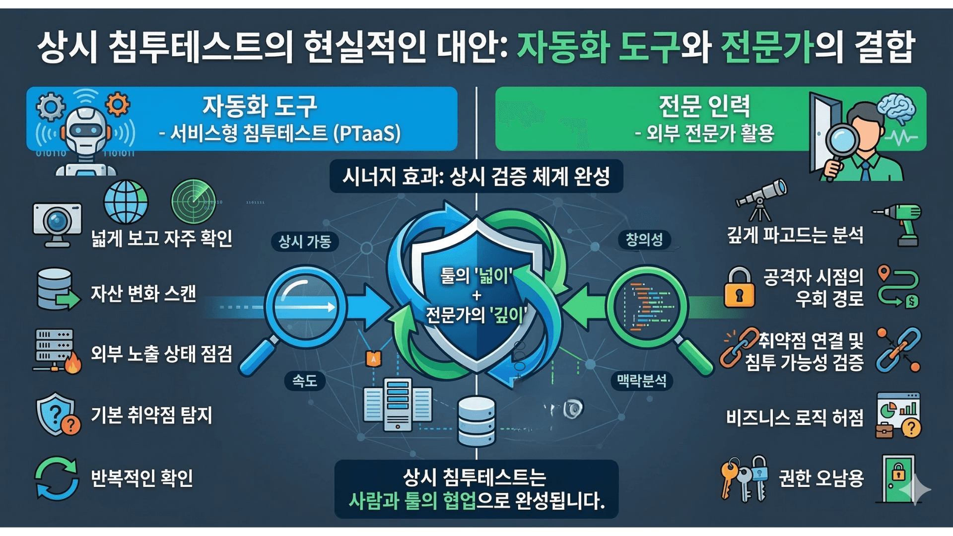 caption - 침투테스트 상시 시대에는 자동화된 도구와 함께 전문가 협업이 필요하다. (Gemini 제작)