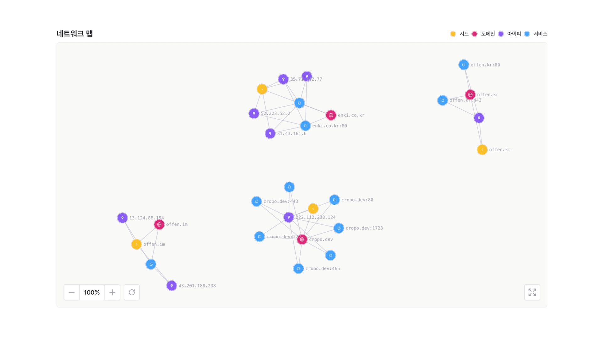 도메인·IP·포트 간 연결 관계를 복잡한 텍스트 대신 직관적인 그래픽으로 표현합니다. 보안 현황을 파악하세요. 특정 자산이 침해되었을 때, 그 영향이 어떤 경로를 통해 핵심 시스템으로 번져나갈 수 있는지를 네트워크 맵으로 바로 파악할 수 있습니다. 경영진에게 보유 자산 현황을 보고해야 할 때, 긴 설명 없이 네트워크 맵 하나로 상황을 전달할 수 있습니다.