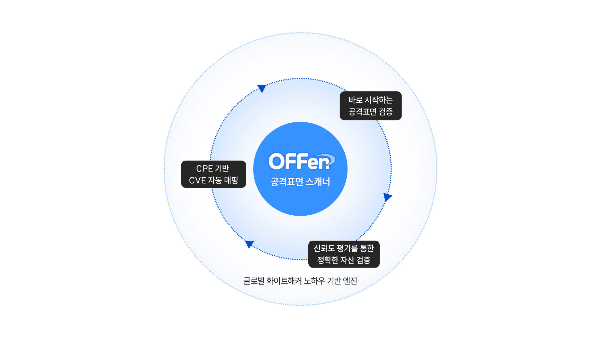 EDR·SIEM 등의 사후 대응 솔루션과 다르게, OFFen ASM은 사고 발생 '전'에 공격자가 악용할 수 있는 모든 진입점을 먼저 찾아내는 선제적 공격 표면 관리 서비스입니다. 또한 OFFen ASM의 차별점은 국내 해킹방어대회 운영 점유율 1위, DEF CON 우승 경력을 보유한 화이트해커들의 노하우가 스캔 엔진 자체에 집약되어 있습니다.