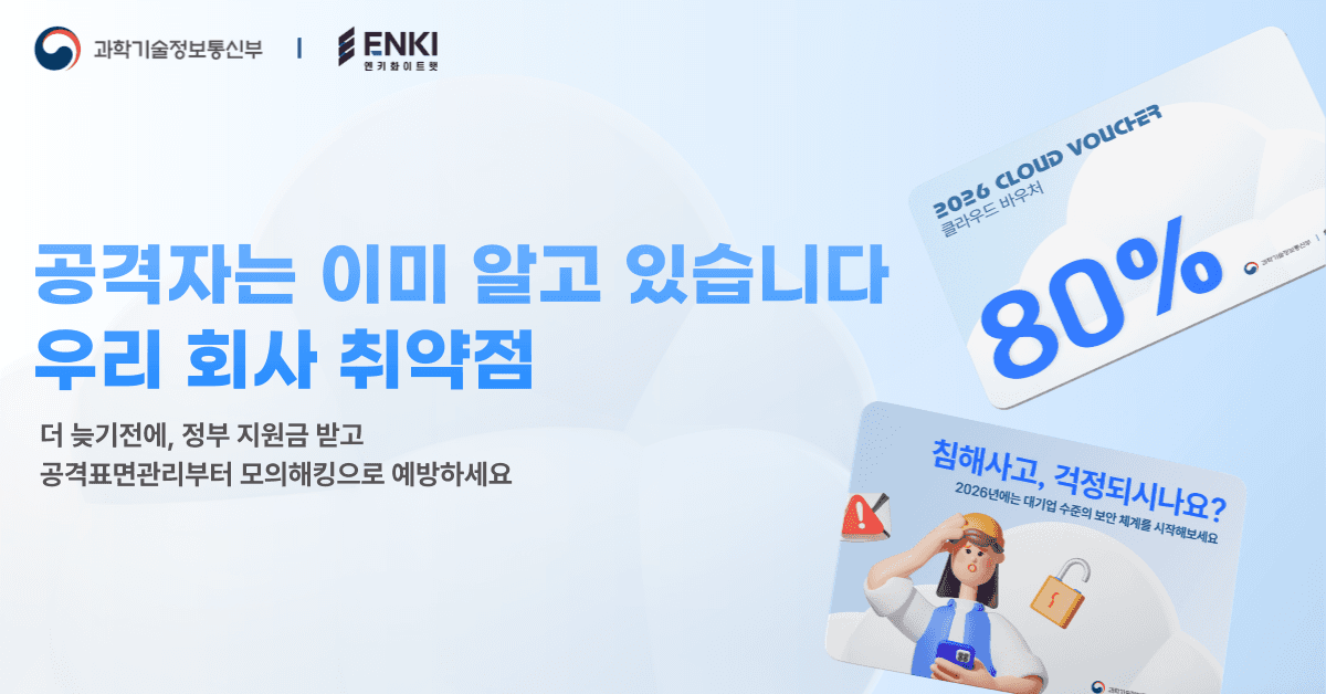 대기업과 금융권에서 검증된 엔키화이트햇의 공격 표면 관리 서비스를 2026년 한 해 동안 경제적인 비용으로 경험해 보시기 바랍니다. 실전 경험이 풍부한 화이트해커 그룹이 귀사의 보안 사각지대를 해소하는 든든한 조력자가 되어드리겠습니다.