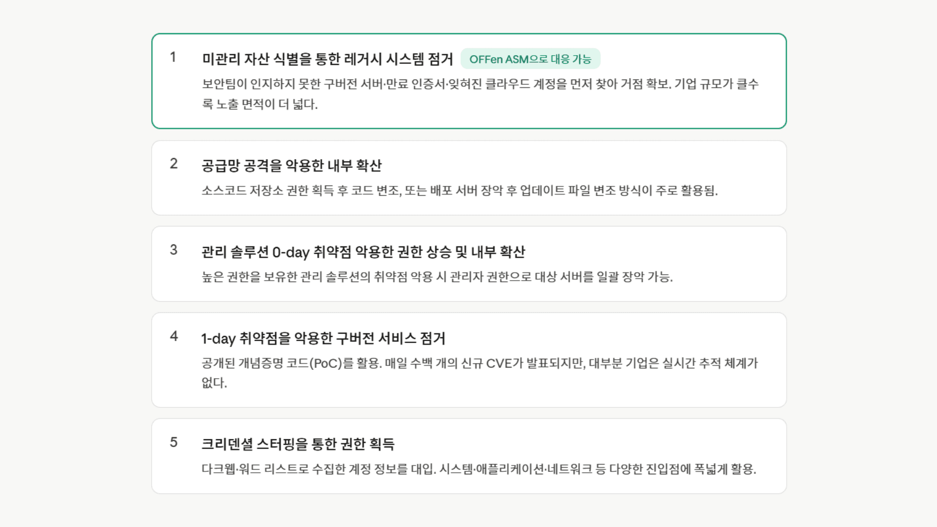 주목할 점은 이 공격루트들이 유기적으로 연결되어있다는 것입니다. 미관리 자산이 거점이 되어 내부 확산(2위)으로 이어지고, 패치되지 않은 서비스는 1-day 취약점(4위)의 먹잇감이 됩니다. 미관리 자산 하나가 도미노처럼 연쇄 침해로 이어지는 구조입니다.