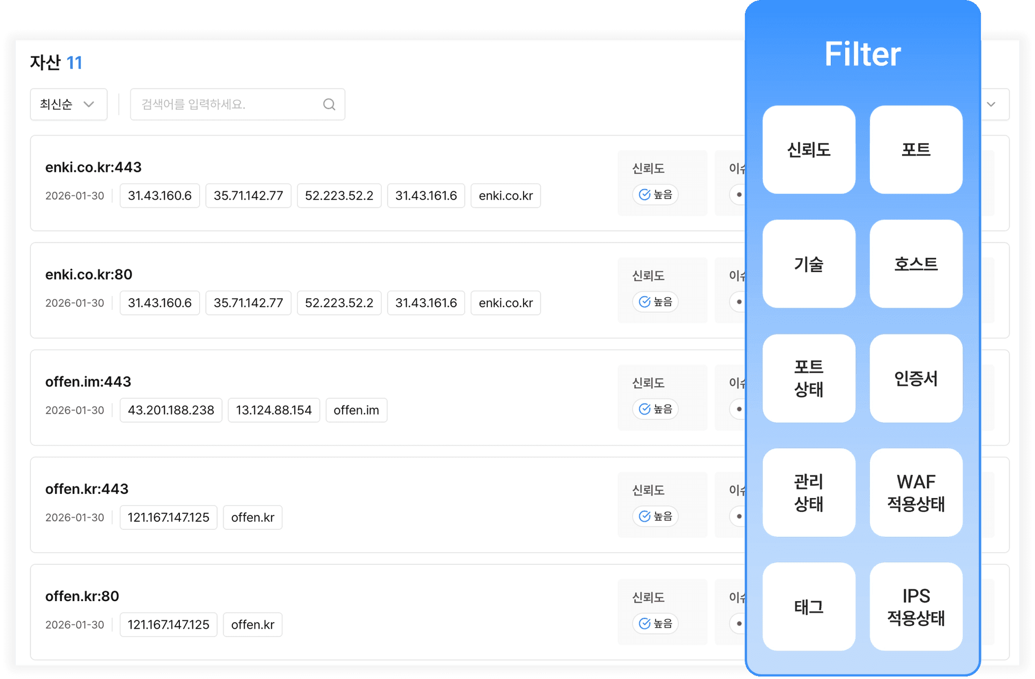 메인 도메인 기준 발견된 각 서브도메인을 엔키화이트햇이 보유한 수많은 프로젝트 수행 데이터와 대조하여 중요도를 평가합니다.