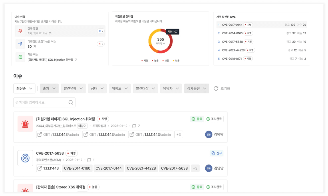 Action-Plan 제공: 세계 해킹 방어 대회 우승 경력의 화이트해커들이 실제 피해 시나리오를 가정하고, CVE 재현 보고서와 맞춤형 해결 전략을 직접 제안합니다.